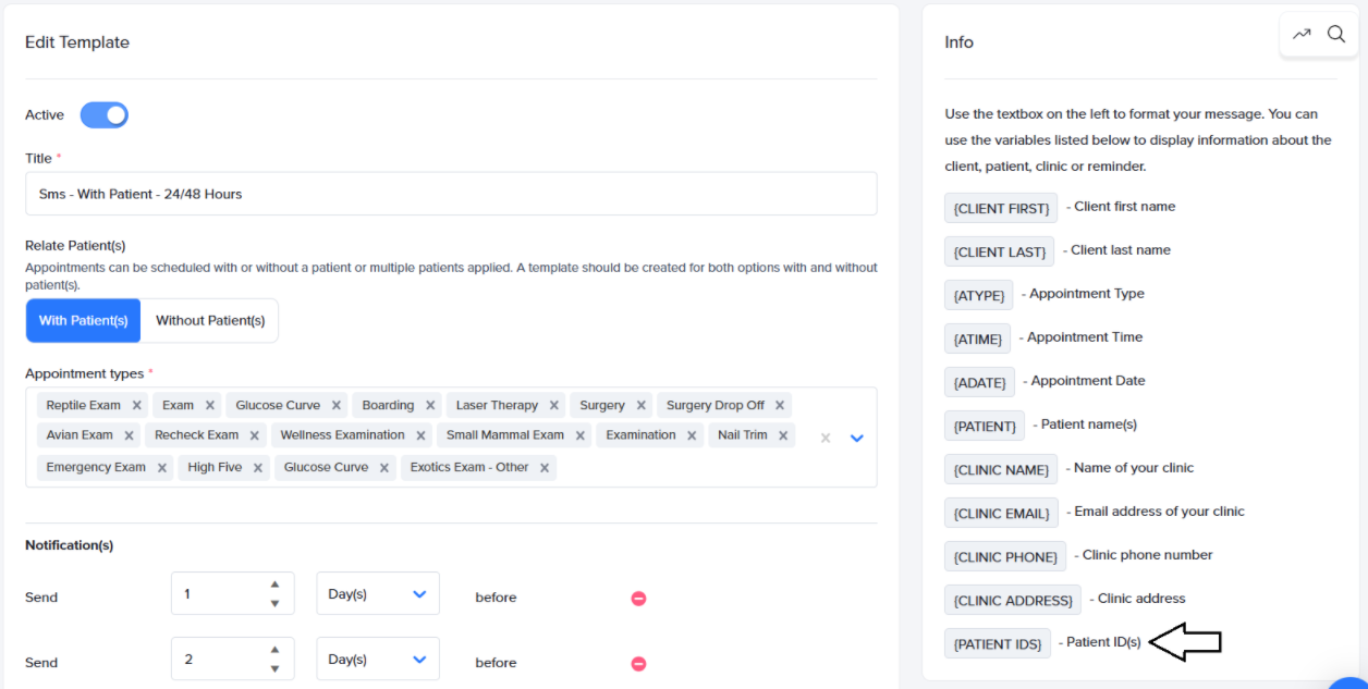 Our updated Appointment SMS Notifications make it easy to ensure accurate identification of the associated patient. You can now include a patient ID in both appointment SMS notification message templates and forms, making it easier to connect individual patients with the communications you have sent or are planning to send.